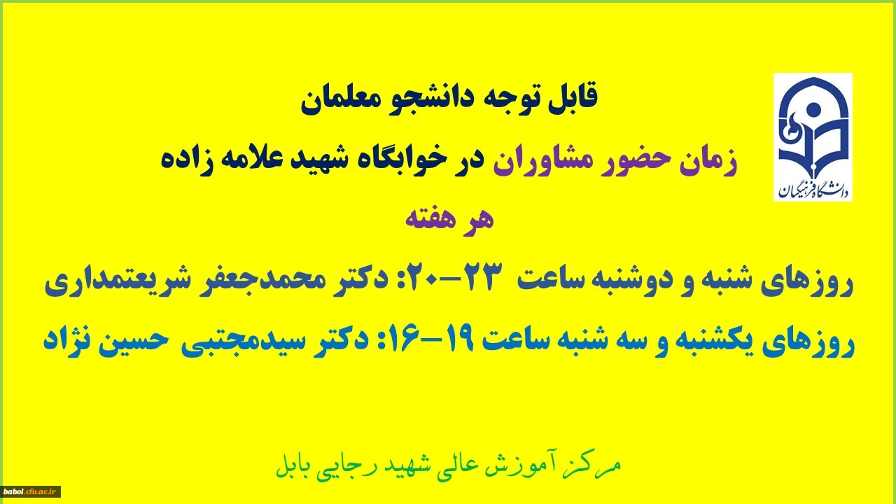 زمان حضور استادان مشاوره در خوابگاه مرکز
