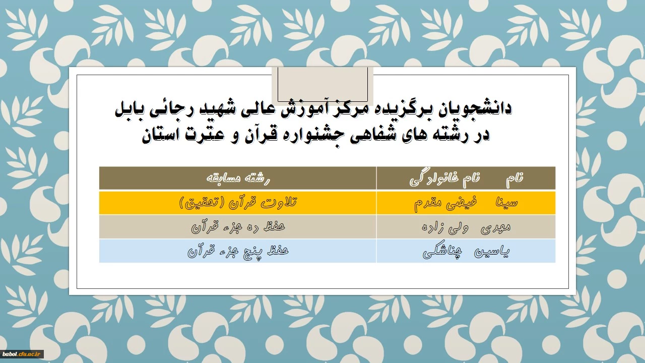 امتیاز دهید : نفرات برگزیده رشته های شفاهی جشنواره قرآن و عترت استان سهشنبه 9 اردیبهشت 1393 ساعت 12:59