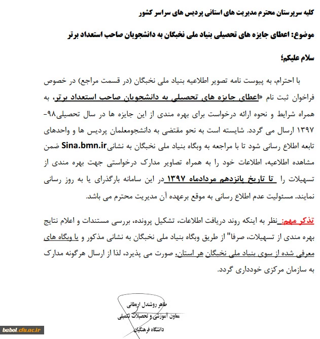 اطلاعیه بنیاد ملی نخبگان قابل توجه دانشجویان