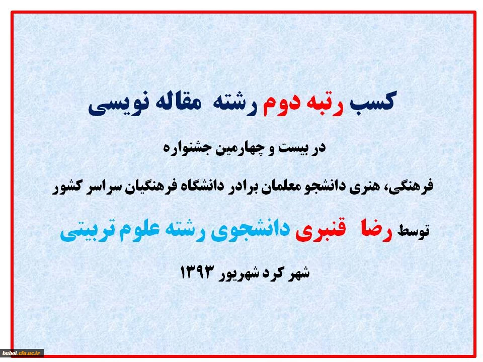 کسب رتبه دوم رشته مقاله نویسی در بیست و چهارمین جشنواره فرهنگی، هنری دانشجو معلمان برادر دانشگاه فرهنگیان سراسر کشور توسط رضا قنبری دانشجوی رشته علوم تربیتی ورودی91 در شهر کرد