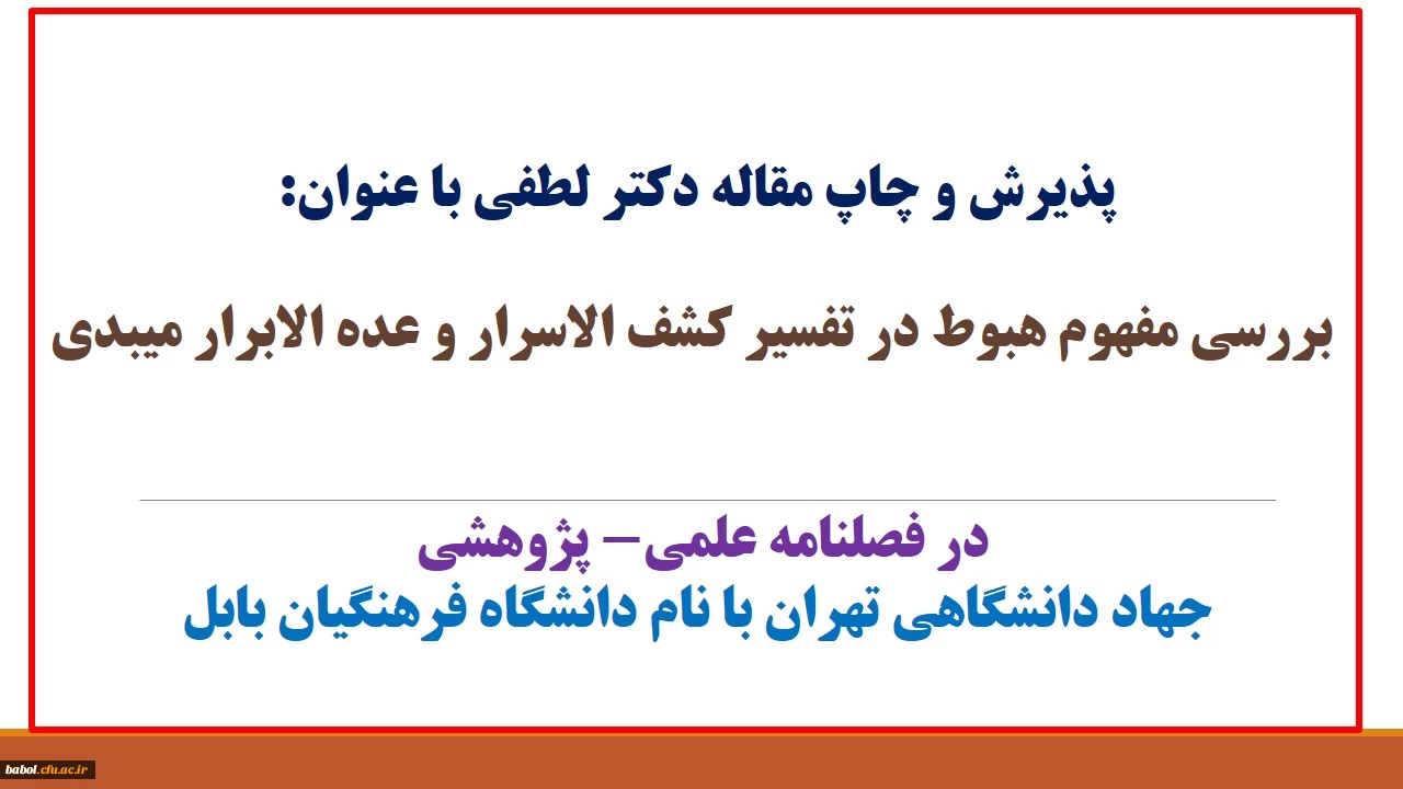 پذیرش و چاپ مقاله دکتر لطفی با عنوان: بررسی مفهوم هبوط در تفسیر کشف الاسرار و عده الابرار میبدی در فصلنامه علمی- پژوهشی